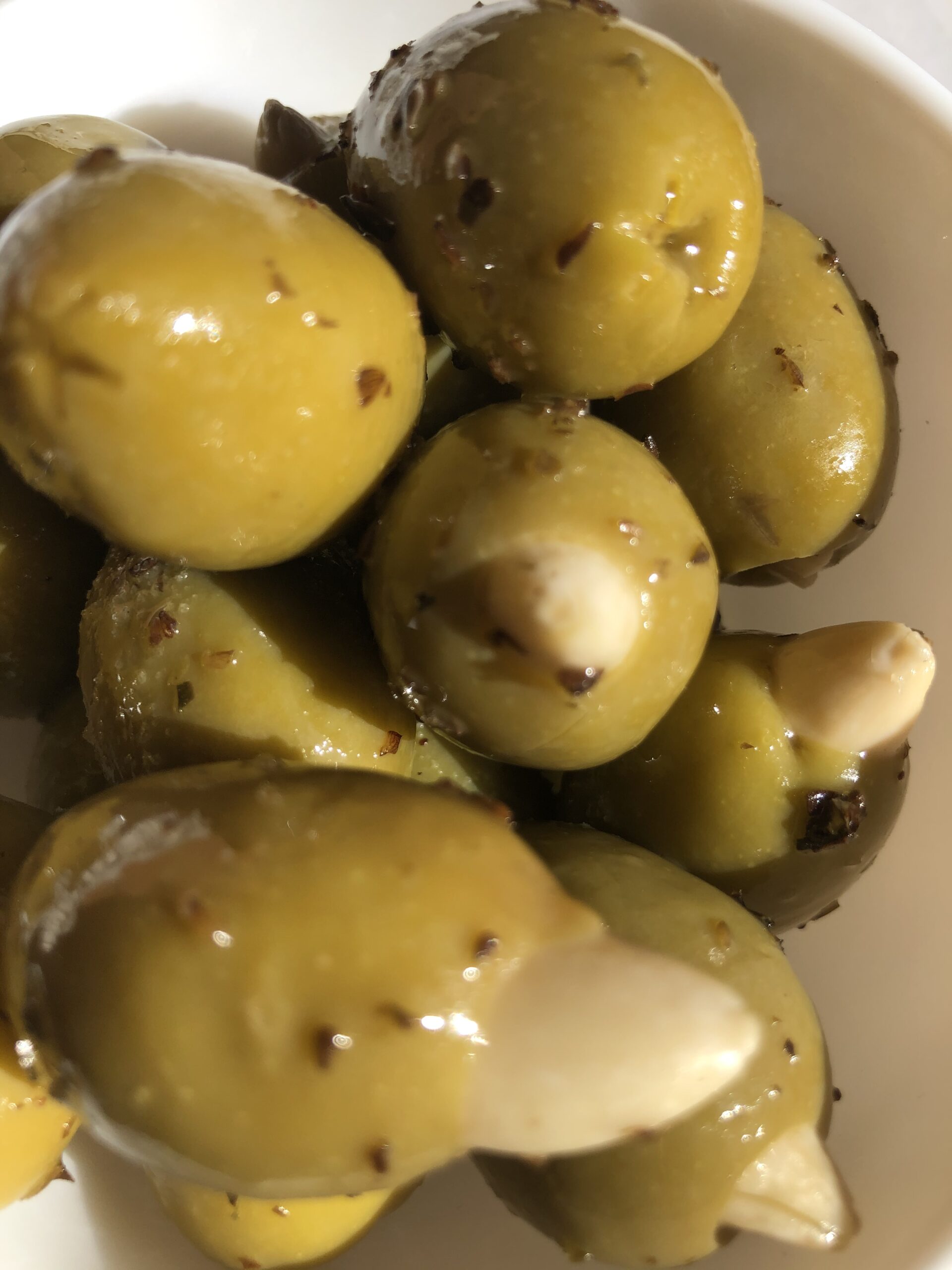 Fresh ready-to-eat green Halkidiki Olives, hand-stuffed with Almonds, hand-marinated in Extra Virgin Olive Oil and Wild Mountain Herbs. Supplied in packs or pots of approx 230g