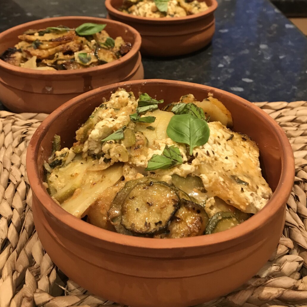 Our ever-popular oven-baked dish of courgettes, cheese, garlic, potatoes, herbs, XV olive oil.