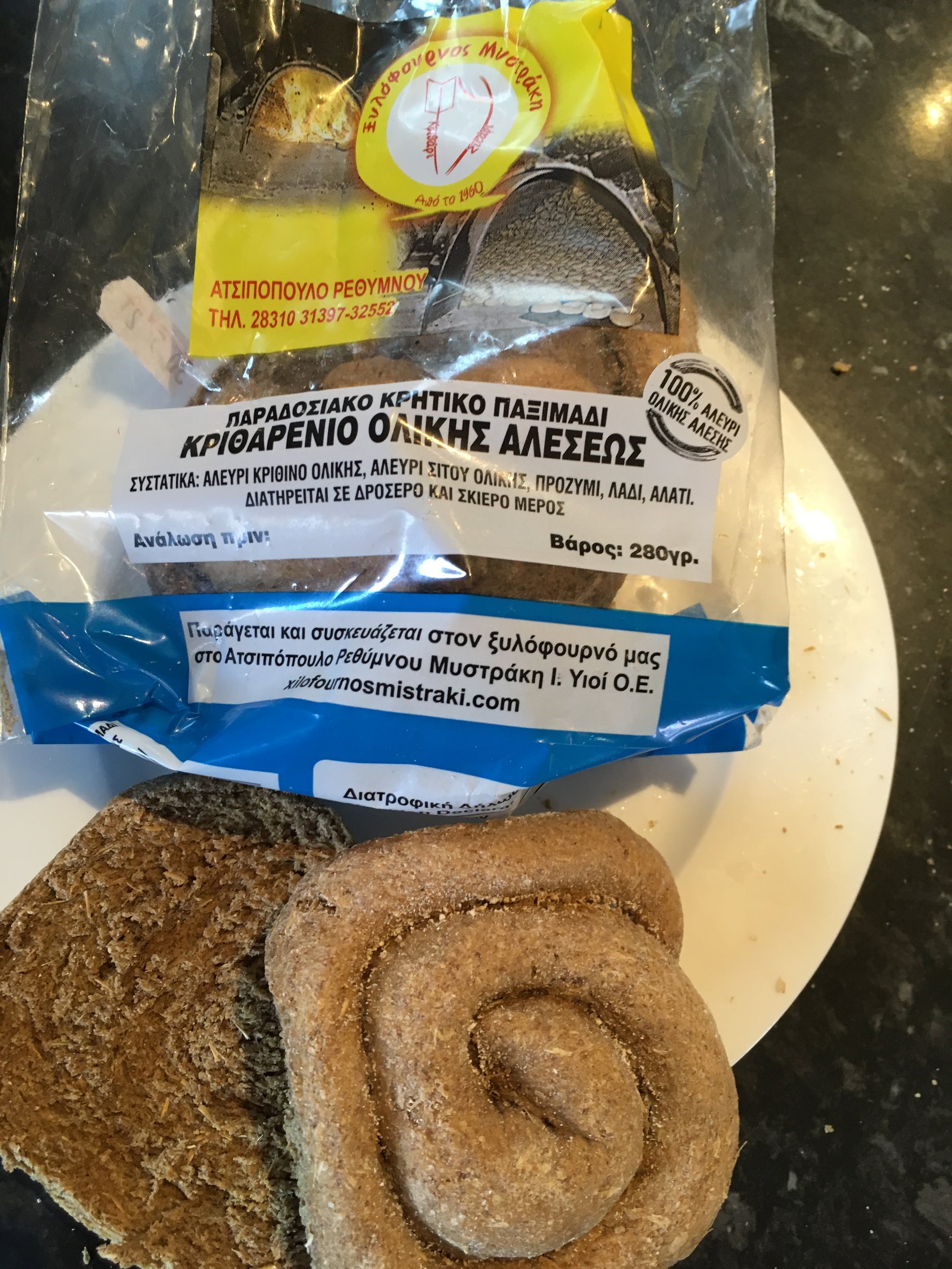 Traditional Cretan Sour-dough Rusks made from Barley Flour, Wholegrain Wheatflour and olive oil. Eat drenched in olive oil and topped with our creamy sheep cheese, tomatoes and oregano.