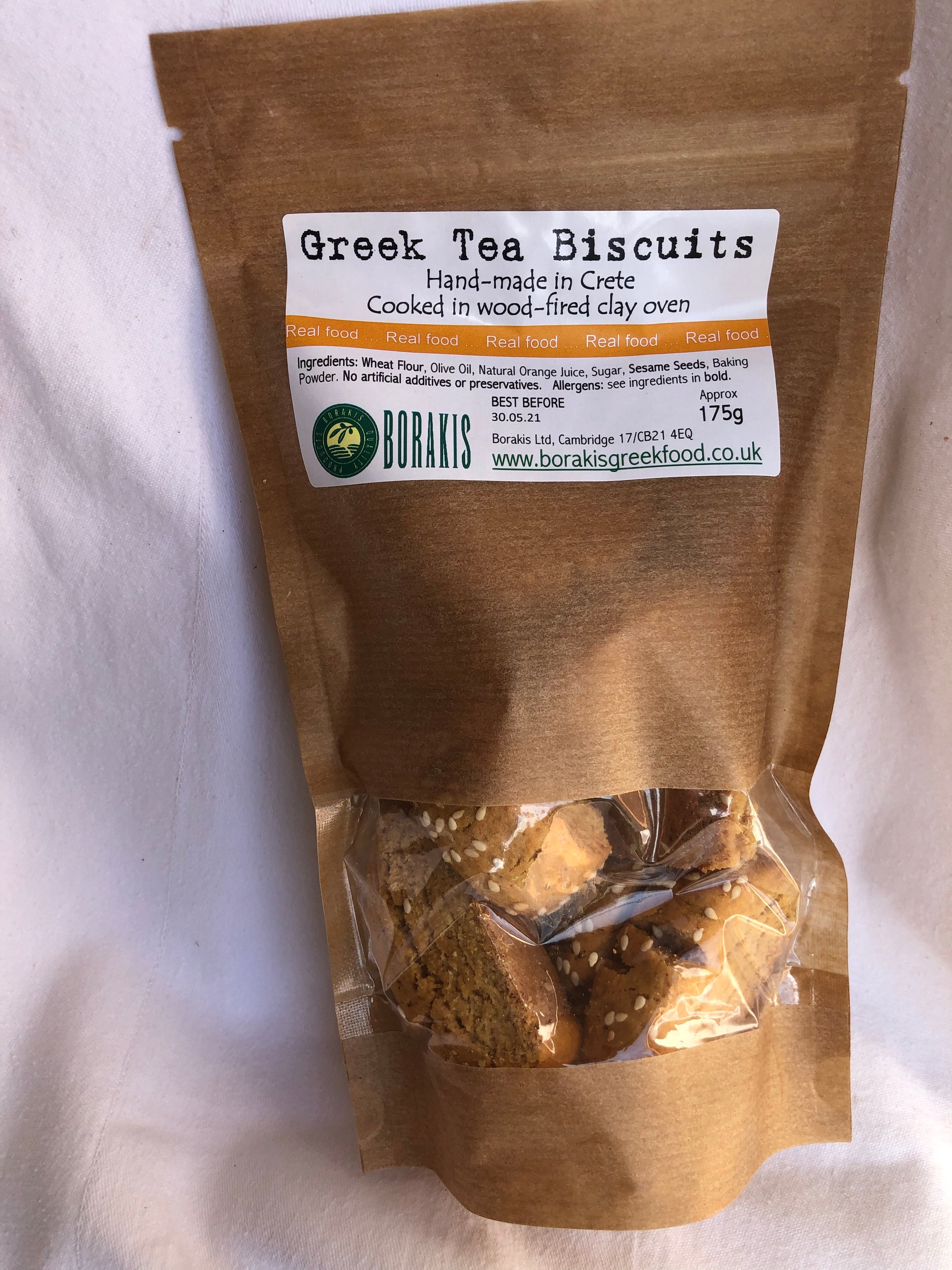 Ingredients (allergens in bold): Wheat flour, Olive Oil, Natural Orange Juice, Organic Sugar, Sesame Seeds, Baking Powder