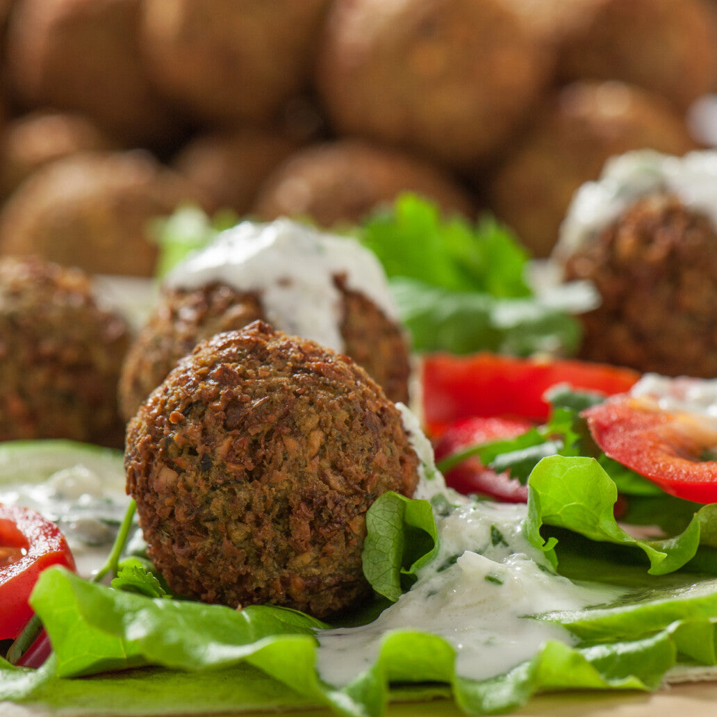 Home-made Falafel (6) accompanied by tangy Tzatziki, a selection of marinaded olives, cheese-stuffed peppers and stuffed vine leaves.