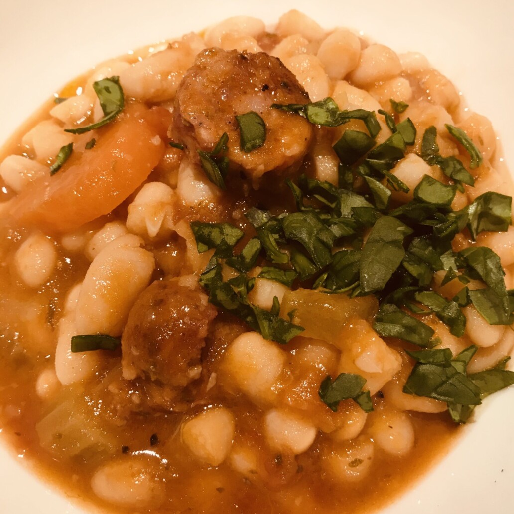Tasty Casserole of Beans, Loukanika (Greek Sausage), vegetables, tomatoes, herbs and XV Olive Oil.