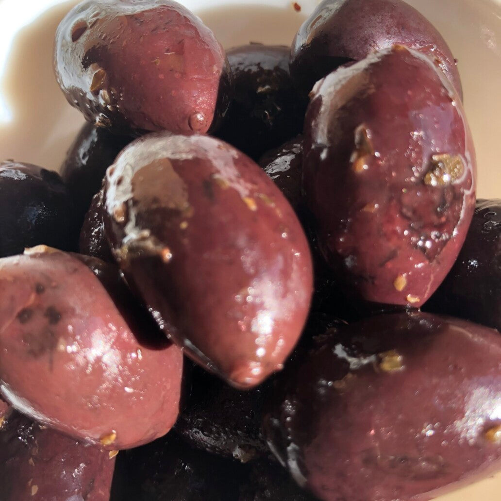 Plump ready-to-eat Kalamata Olives, stone-in, hand-marinated in Extra Virgin Olive Oil and Wild Mountain Herbs. Supplied in packs or pots of approx 230g.