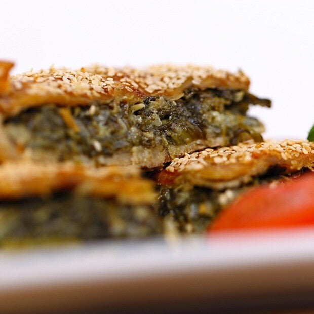 Ingredients (allergens in bold): Spinach, Feta Cheese both Sheep and Goat, XV Olive Oil, Onions, Salt, Pepper, Dried Herbs, Pastry (Wheat Flour, Salt, XV Olive Oil, Sunflower Oil, Sesame Seeds)